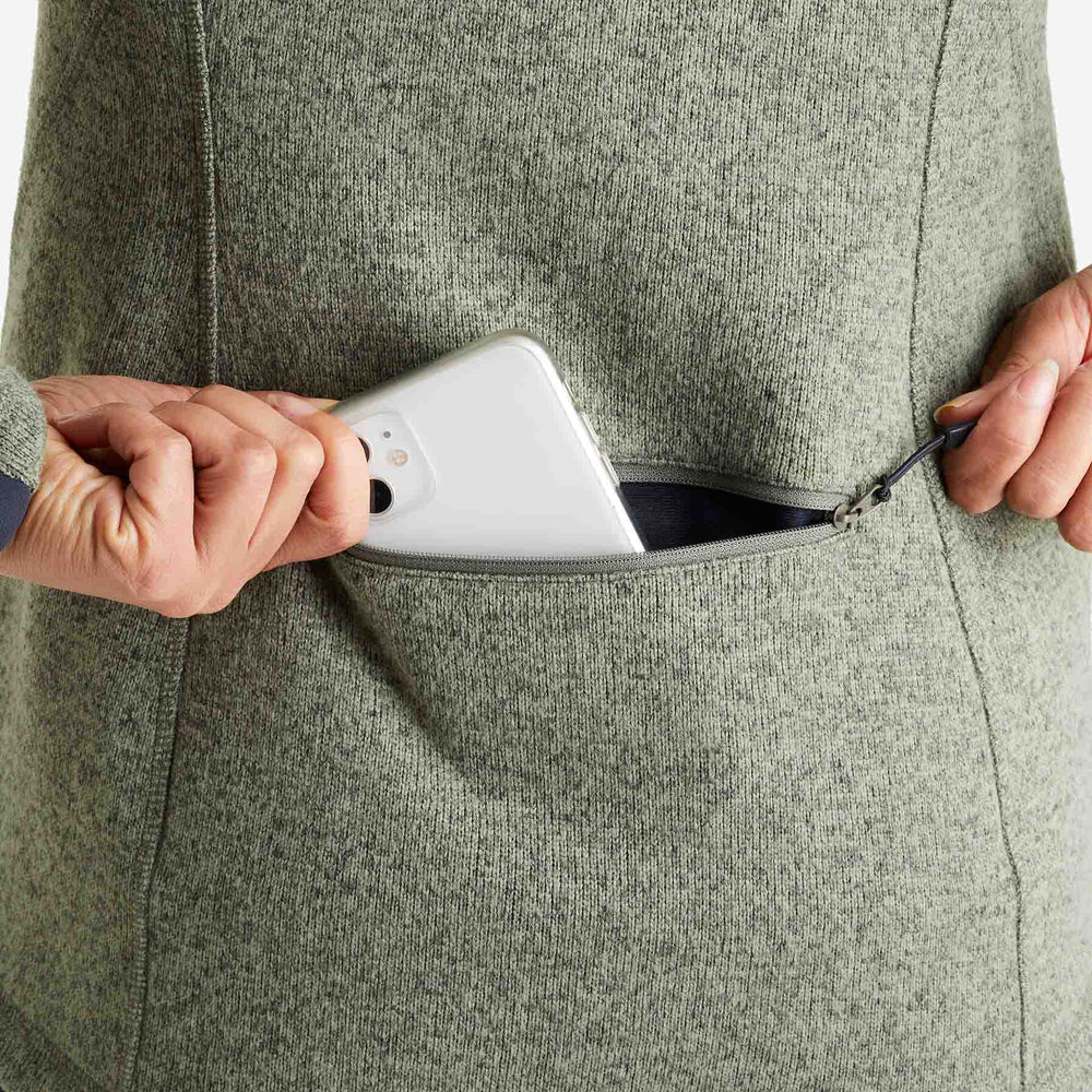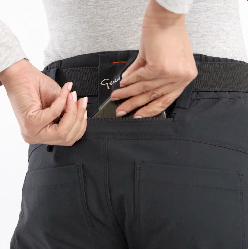 Genus has found the perfect solution with a zipped pocket in the small of the back. Once in place, you don't feel the phone, but you can easily pull it out as soon as you hear it ring.
