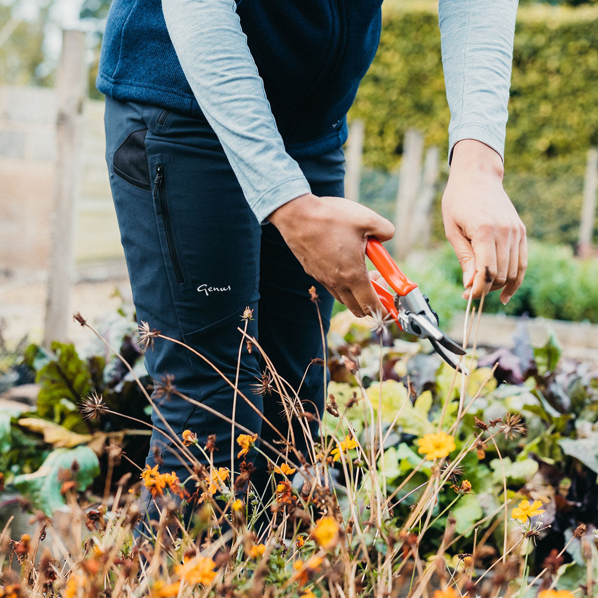- Zipped thigh pockets for seed packets, labels, or bits and bobs